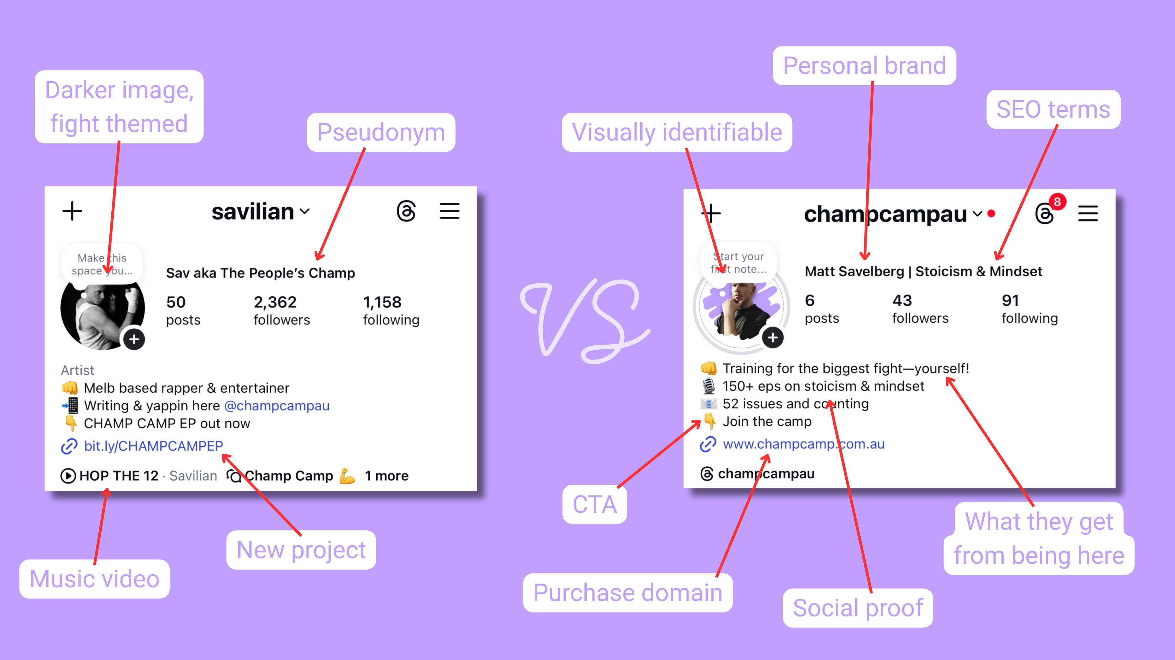 Matt Savelberg: lighter and more inviting, using #c0a0ff as brand accent—carousels, educational reels, brand-centric memes.